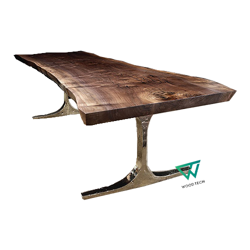 Chiếc bàn ăn gỗ óc chó tự nhiên với ván gỗ dày, bề mặt uốn lượn giữ nguyên bản từ tấm ván gỗ xẻ ra từ thân cây gỗ óc chó. Chân gỗ inox được cách điệu, nhìn mỏng manh nhưng lại vô cùng chắc chắn tỏa sáng dưới ánh đèn.