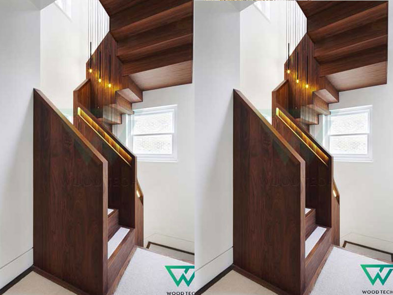 Cầu thang gỗ óc chó mang vẻ đẹp kiêu sang, hiện đại góp phần làm bừng sáng không gian khu vực cầu thang. Ngày nay, dạng cầu thang này còn được kết hợp với các chất liệu khác như kính hoặc inox để tạo sự mới lạ và vẻ thanh mảnh cho cầu thang. Cũng có gia chủ lại chỉ thích cầu thang được làm hoàn toàn từ gỗ, từ mặt bậc cầu thang đến lan can, tay vịn và trụ đều được làm từ gỗ. Tùy gia chủ với cá tính và gu thẩm mỹ khác nhau sẽ chọn cho mình 1 phong cách thiết kế cầu thang gỗ riêng biệt.