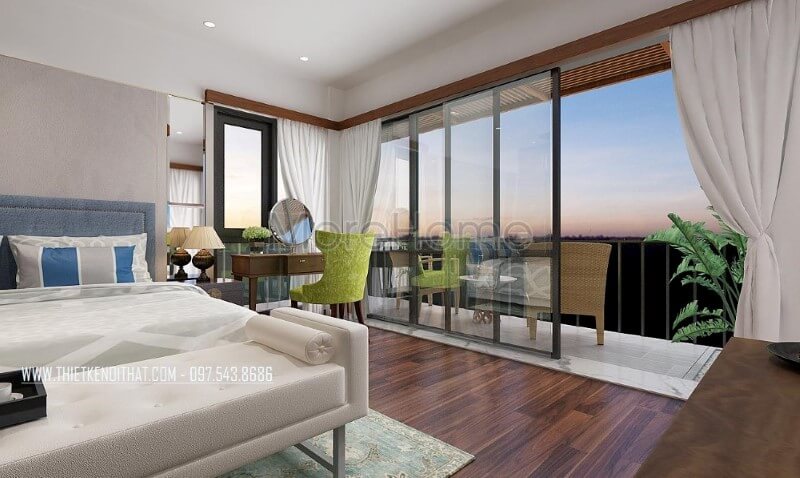Cách bố trí khoa học và hợp lí của nội thất phòng ngủ biệt thự hiện đại, ngăn cách với ban công là cửa kính cường lực an toàn giúp căn phòng thêm phần sinh động cũng như đó những luồn gió mới vào phòng