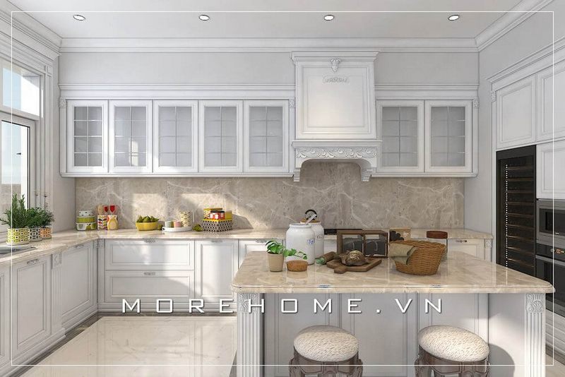 Thiết kế phòng bếp kiểu pháp với tông màu trắng tinh khôi, tinh tế
