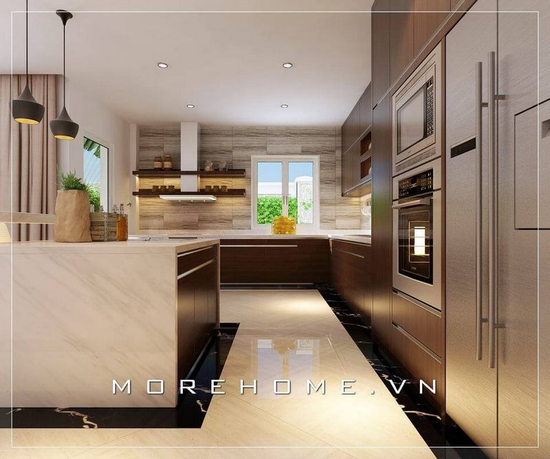 Thiết kế nội thất phòng bếp biệt thự hiện đại với tone màu nâu - trắng tạo cảm giác hài hòa, thoải mái hơn trong không gian nấu nướng của người nội trợ