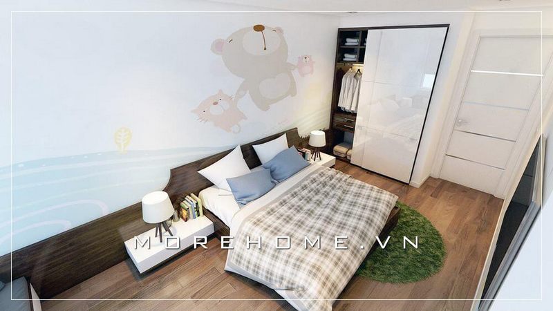 Phòng ngủ của con được thiết kế đơn giản với một giường gỗ công nghiệp, mảng tường đầu giường được làm bằng giấy dán tường hoa màu tím nhạt, tạo nên sự hài hòa và nhẹ nhàng.