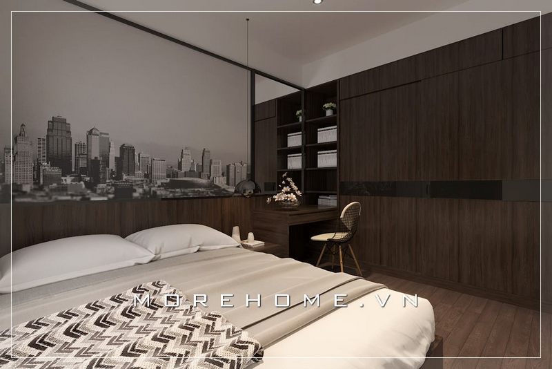 Tủ quần áo hiện đại với gam màu nâu gỗ chủ đạo, đường vân gỗ ấn tượng góp phần tạo nên sự ấm áp và thoải mái, làm cho căn phòng trở nên yên bình hơn.